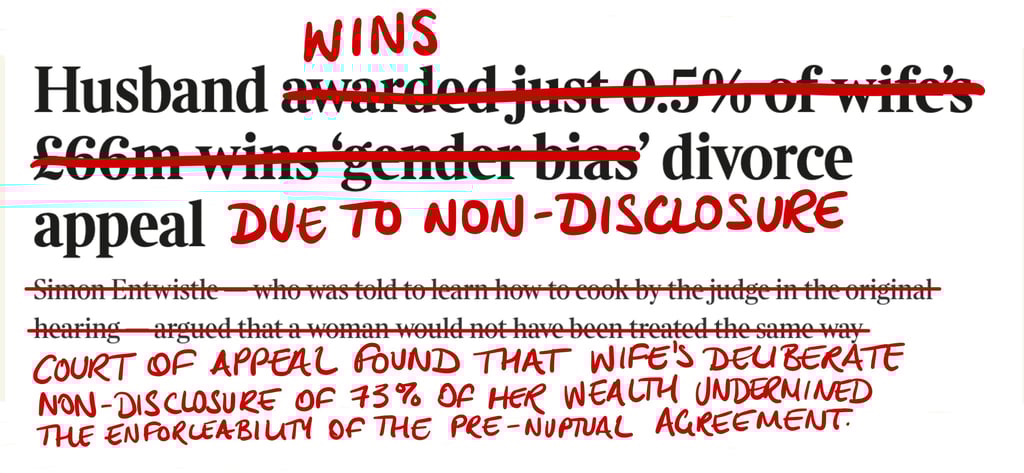 Recent headlines have erroneously positioned the Court of Appeal’s decision in Helliwell v Entwistle [2025] EWCA Civ 1055 as a victory against gender discrimination in the family courts. It wasn’t. This appeal turned on the enforceability of a pre-nuptial agreement (PNA) in the face of deliberate non-disclosure of 73% of the wife’s wealth.