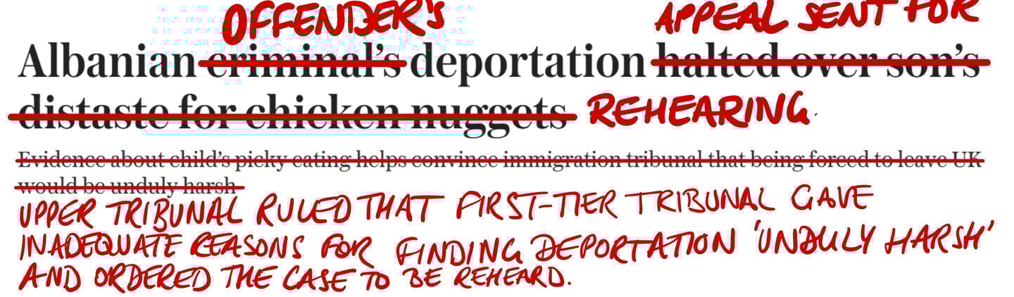 The Telegraph reported on the 9th February 2025 the following: “Albanian criminal’s deportation halted over son’s distaste for chicken nuggets”. This article is a gross mischaracterisation of the judgement and the legal principles involved in this Upper Tribunal Appeal.